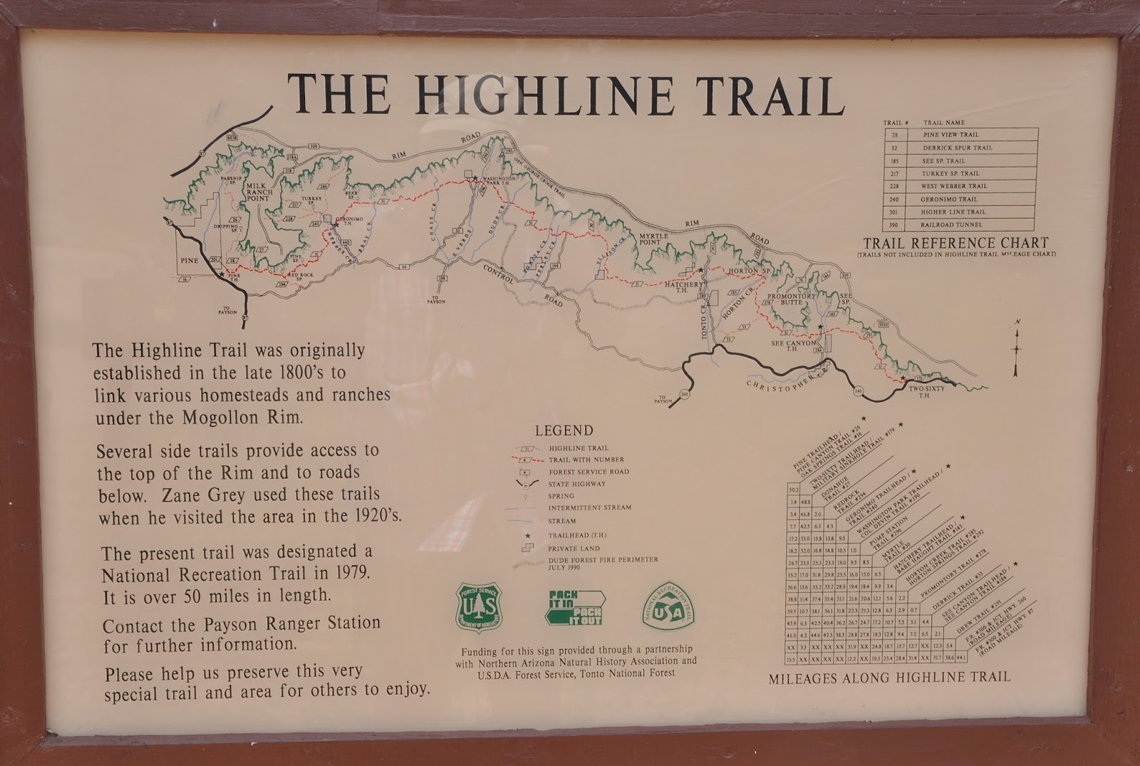 The Pine Trailhead is about 15 miles on Highway 87 north of Payson near the southern part of Strawberry. The Pine Trail loop is rated easy but it is also the entry point for other rim trails including the Highline Trail.
